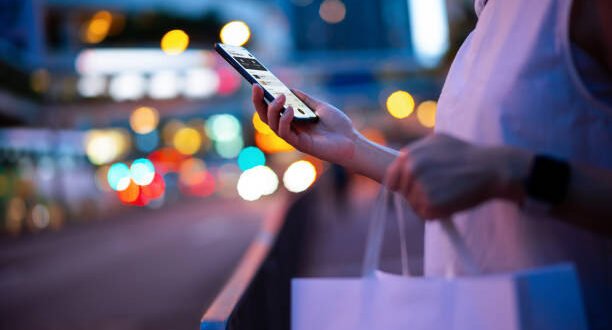 Young woman carrying a paper shopping bag, managing online banking on smartphone in city street against illuminated street lights. Tracking and planning spending. Transferring money, paying bills, checking account balances. Smart banking with technology