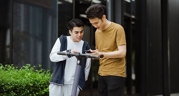 Friends exploring the city, stopping to check their phone for navigation. A mix of friendship, digital tools, and sustainable transport.